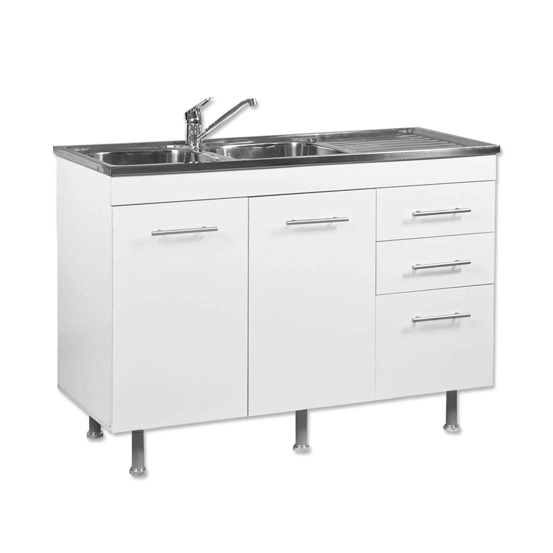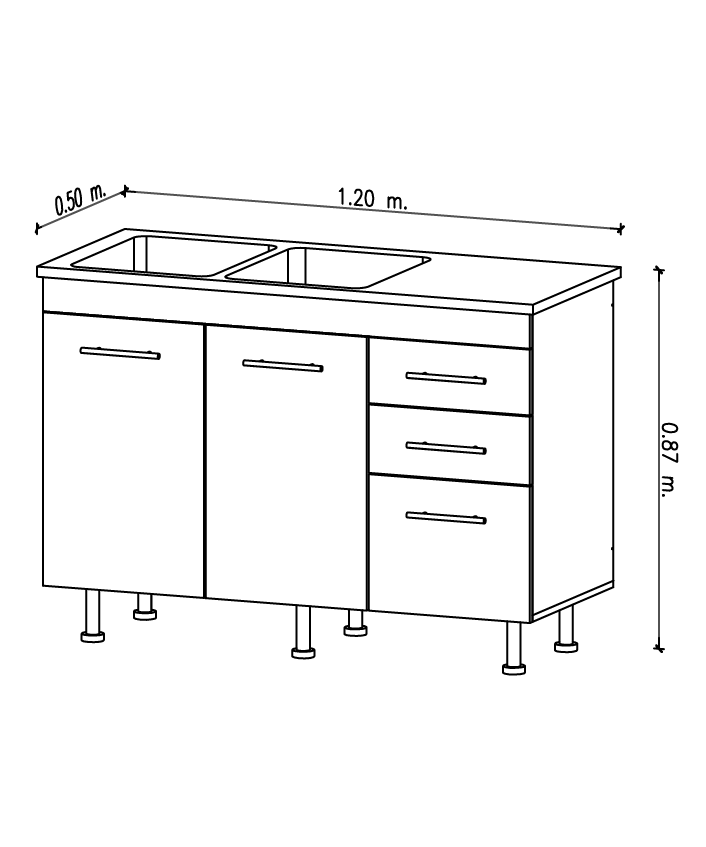 | Descripción del Producto: | Bajo mesada 2 puertas de abrir y 3 cajones con Doble bacha y mesada de acero inoxidable. Patas regulables. Incluye sistema de desagüe. Incluye todos los herrajes de armado. No incluye herrajes para amurar contra la pared. |