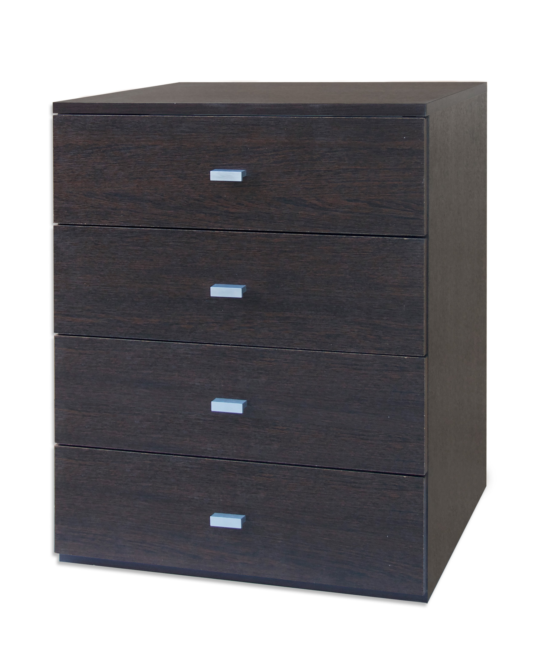 Cajonera de 4 cajones en melamina wengue 15mm., con correderas metálicas y tarugos colocados. Interior del cajón de melamina blanca y fondo Plus. Incluye todos los herrajes de armado. No incluye herrajes para amurar contra la pared. Producto desarmado en caja.
