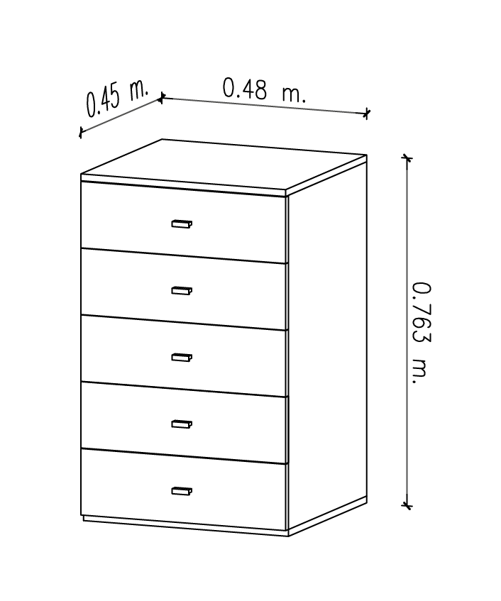 Cajonera de 5 cajones en melamina wengue 15mm., con correderas metálicas y tarugos colocados. Interior del cajón de melamina blanca y fondo Plus. Incluye todos los herrajes de armado. No incluye herrajes para amurar contra la pared. Producto desarmado en caja.