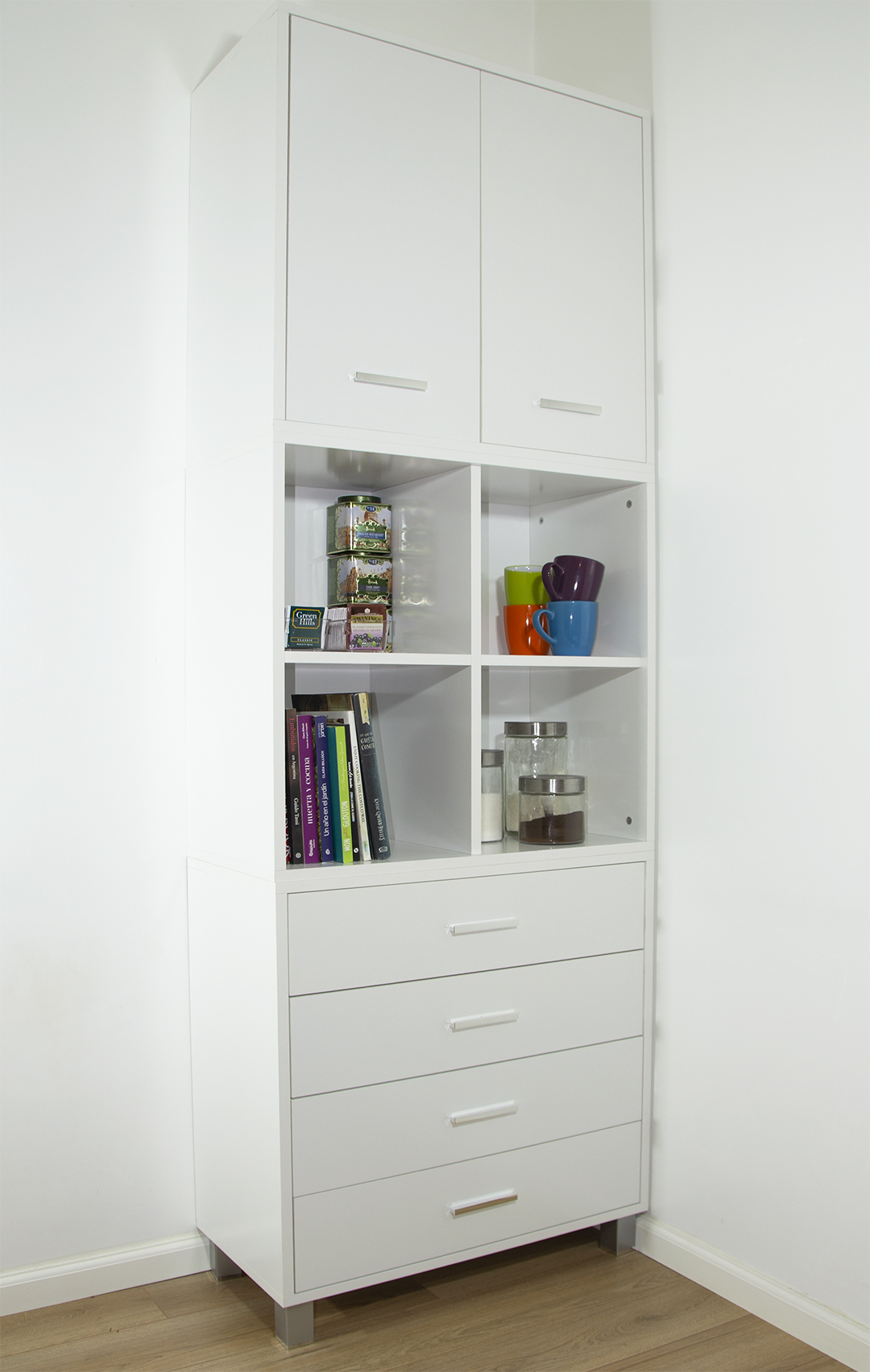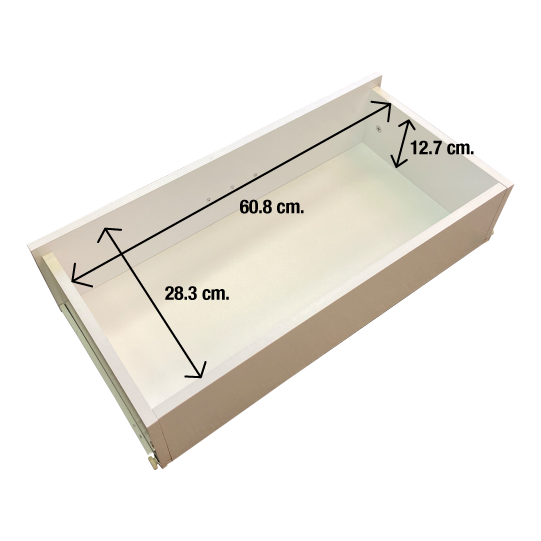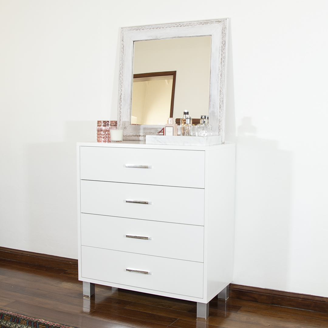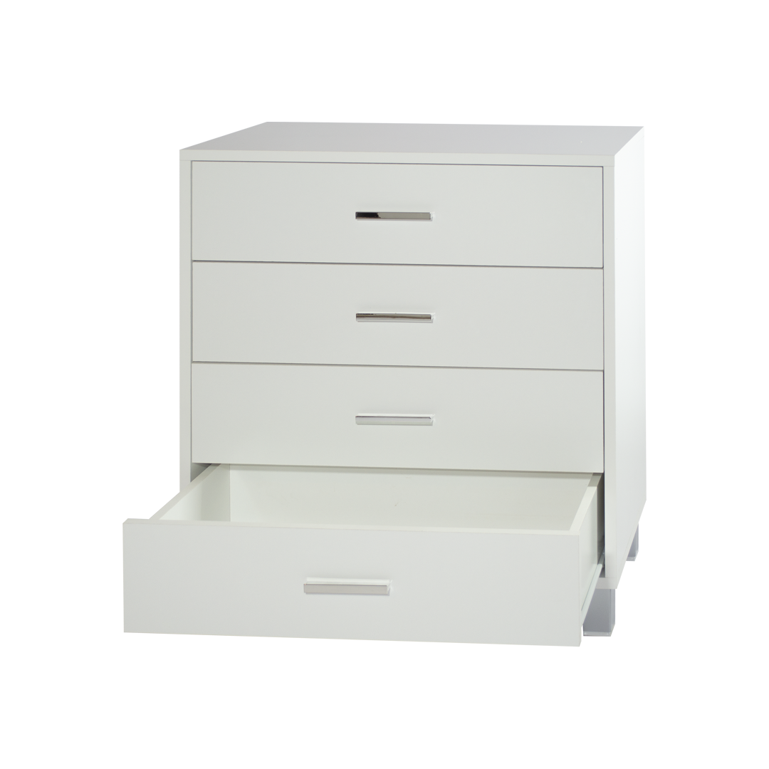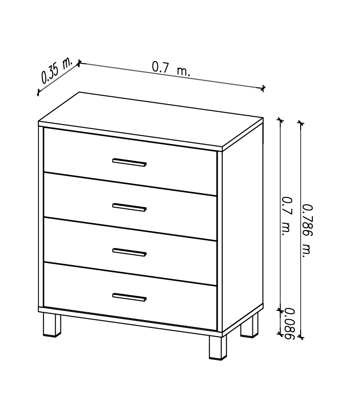 Mueble con 4 cajones de melamina, estructura de melamina blanca de 18 mm. y cajones de melamina 15 mm. Fondo Plus cajón. Incluye fondo del mueble. Correderas metálicas y tarugos ya colocados. Incluye patas plásticas, tiradores plásticos terminación brillante y herrajes de armado. Mueble desarmado en caja.